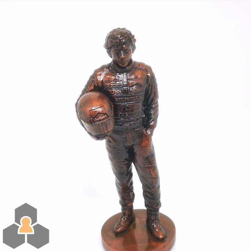 La figura está impresa en una sola pieza en resina de alta calidad, con un tratamiento de pintura metalizada bronce, lo que le da ese aspecto de estatua de bronce.